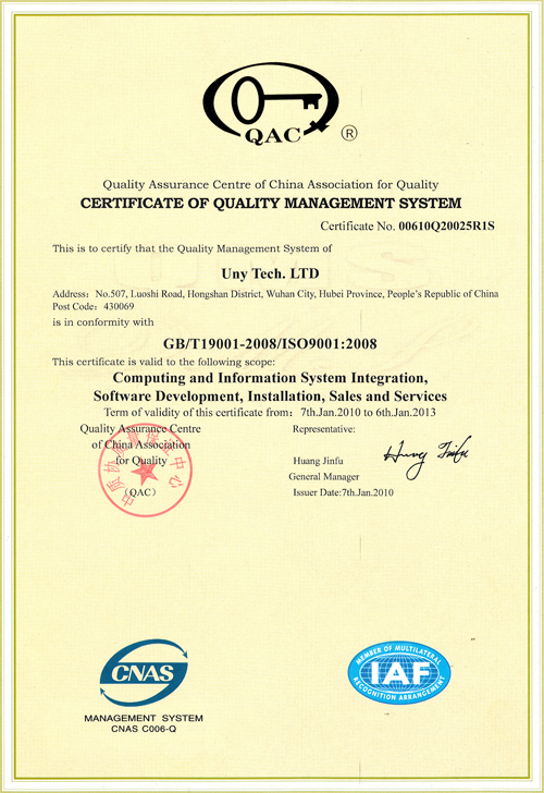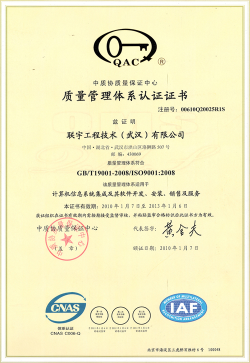 2009年12月24日,联宇质量管理体系经过中质协质量保证中心的严格审核,通过了质量管理体系ISO9001-2008版认证现场审核,并于2010年1月14日收到认证证书。这标志着联宇质量管理体系的又一次提档升级。 本次审核是联宇2007年通过ISO9001-2000质量管理体系认证后的换证审核。由中质协质量保证中心派出的专家审核组,对我公司生产和服务所涉及的各环节、各部门进行了全面检查。他们深入现场与相关部门、相关岗位的人员进行深入交谈,采取随机抽样的方法,寻找符合性证据。经过认真、细致的审核,专家们一致认为:联宇质量管理体系符合标准要求,运行有效,通过现场审核;并郑重地向中质协质量保证中心推荐:对联宇所建立的ISO9001质量管理体系予以认证通过。 联宇视质量为生命,以技术进步为发展之道的经营理念,在此次审核认证中也得到了充分验证。