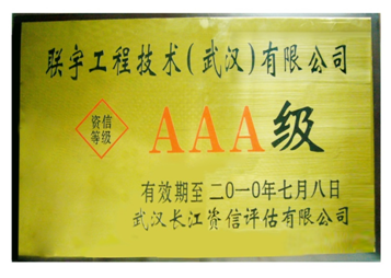 2009年7月8日,联宇工程技术有限公司通过权威资信评估机构--武汉长江资信评估有限公司严格评审,被授予了“AAA”资信等级证书。 据悉,长江资信从企业素质、财务结构、赢利能力、企业效益及发展前景等方面对联宇进行了深入而全面地调查,公司积极配合评估并认真做好各项评定工作。 “AAA” 资信等级表示“信誉极好,清偿能力非常强,风险最小,是资信等级中的最高级别”。获得该资质的企业具有优秀的信用记录,经营状况佳,盈利能力强,发展前景广阔,不确定性因素对其经营与发展的影响极小。 联宇公司能够获此殊荣,无疑是对联宇经营成果、发展前景以及企业信用的客观赞誉和肯定,反映了公司多年来重视管理创新、突出企业效益,进一步提高联宇的市场竞争力和企业的信誉度,使得企业综合实力大幅提升。