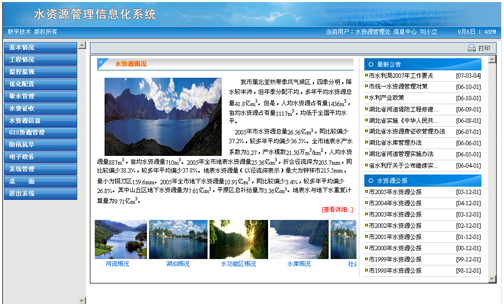 水资源管理信息化系统是我公司针对水资源管理开发出的一套通用性、实用性强的软件。该系统为依法制水,科学管理提供了新一代的管理手段。系统功能设置充分体现了管理工作发展的需要,通用性、实用性强,可在流域、省、市、县各级水政水资源管理工作中推广应用。水资源管理信息化系统为各级水政水资源管理人员方便、高效地利用水资源信息提供多种丰富的可视化手段。系统界面友好,操作简便,具有稳定性、可重用性、易维护性等优点。