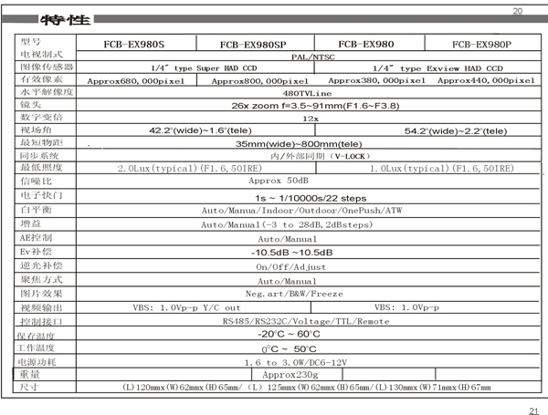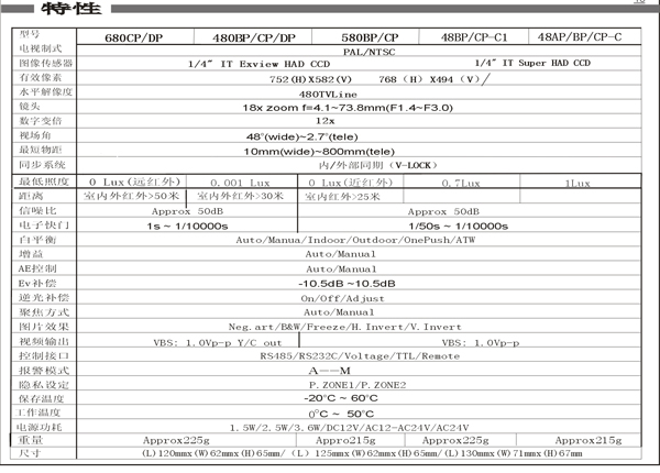 电源: 2 Pin接口/ RS-485: 2 Pin接口/ PTZ Control: 3 Pin接口/视频输出: 1 BNC |