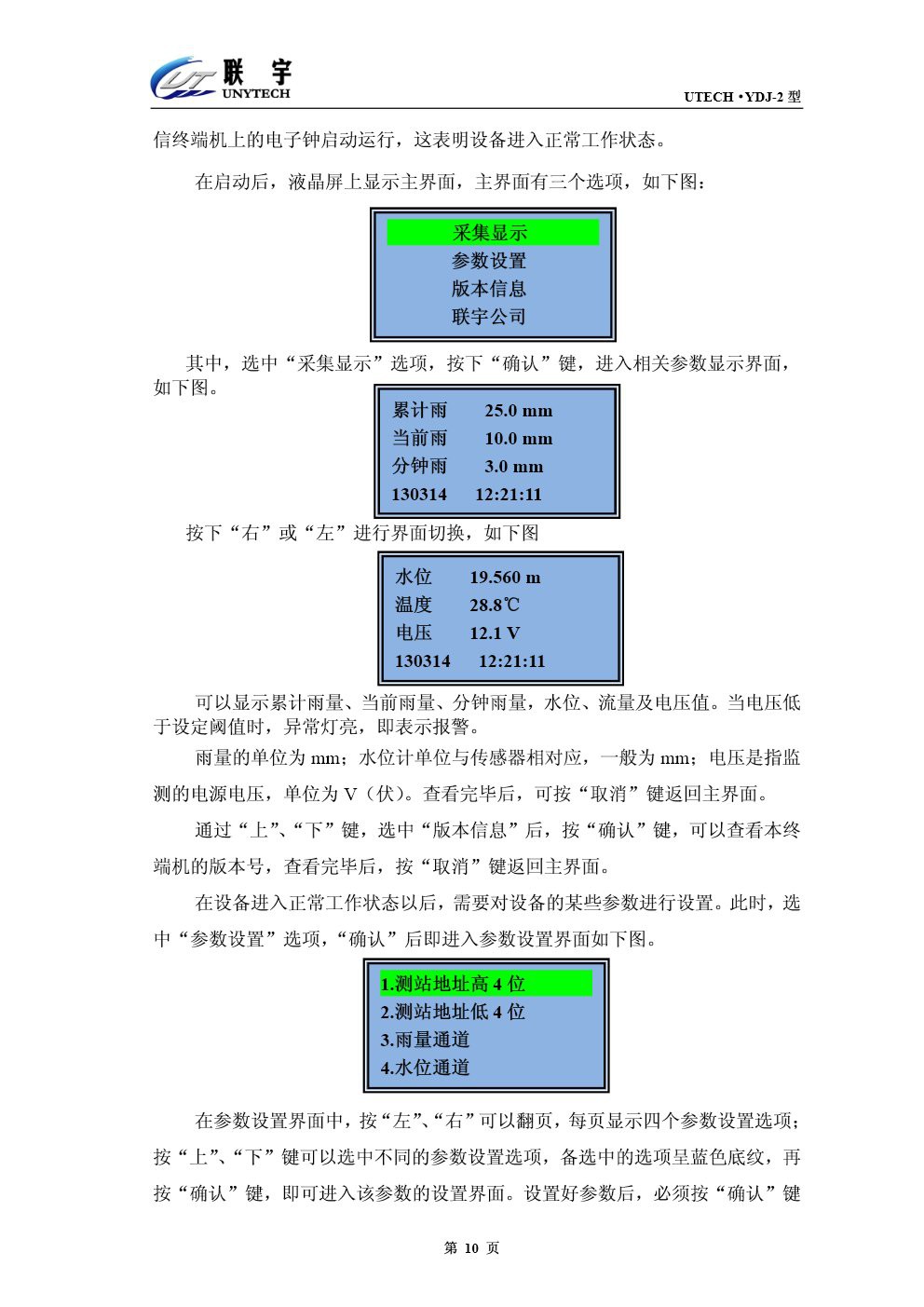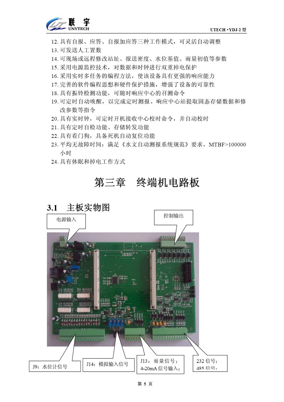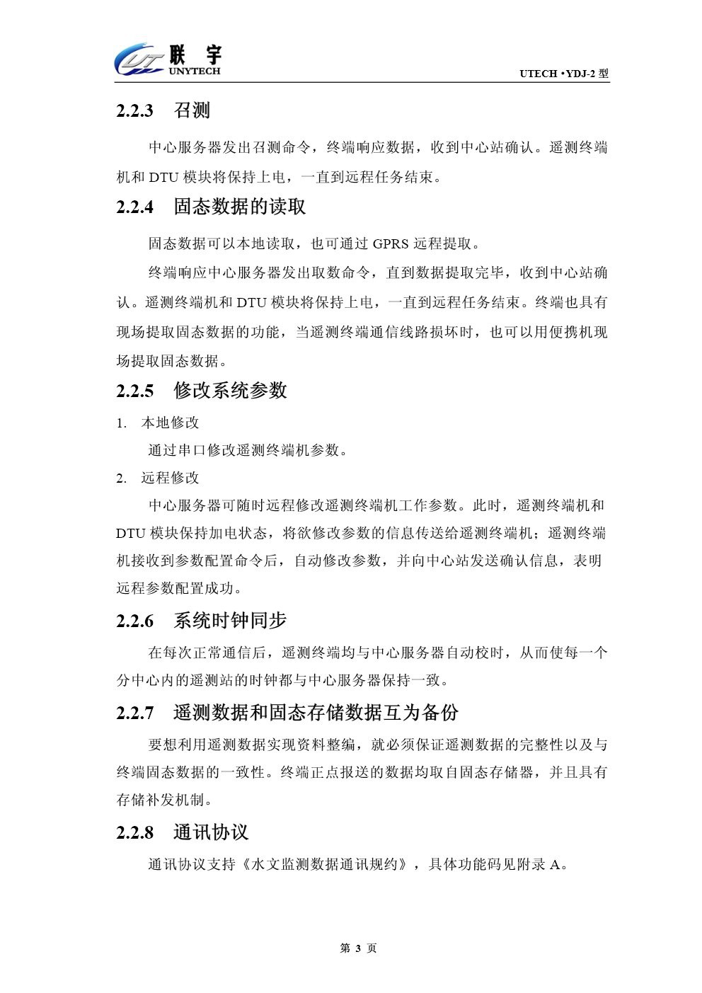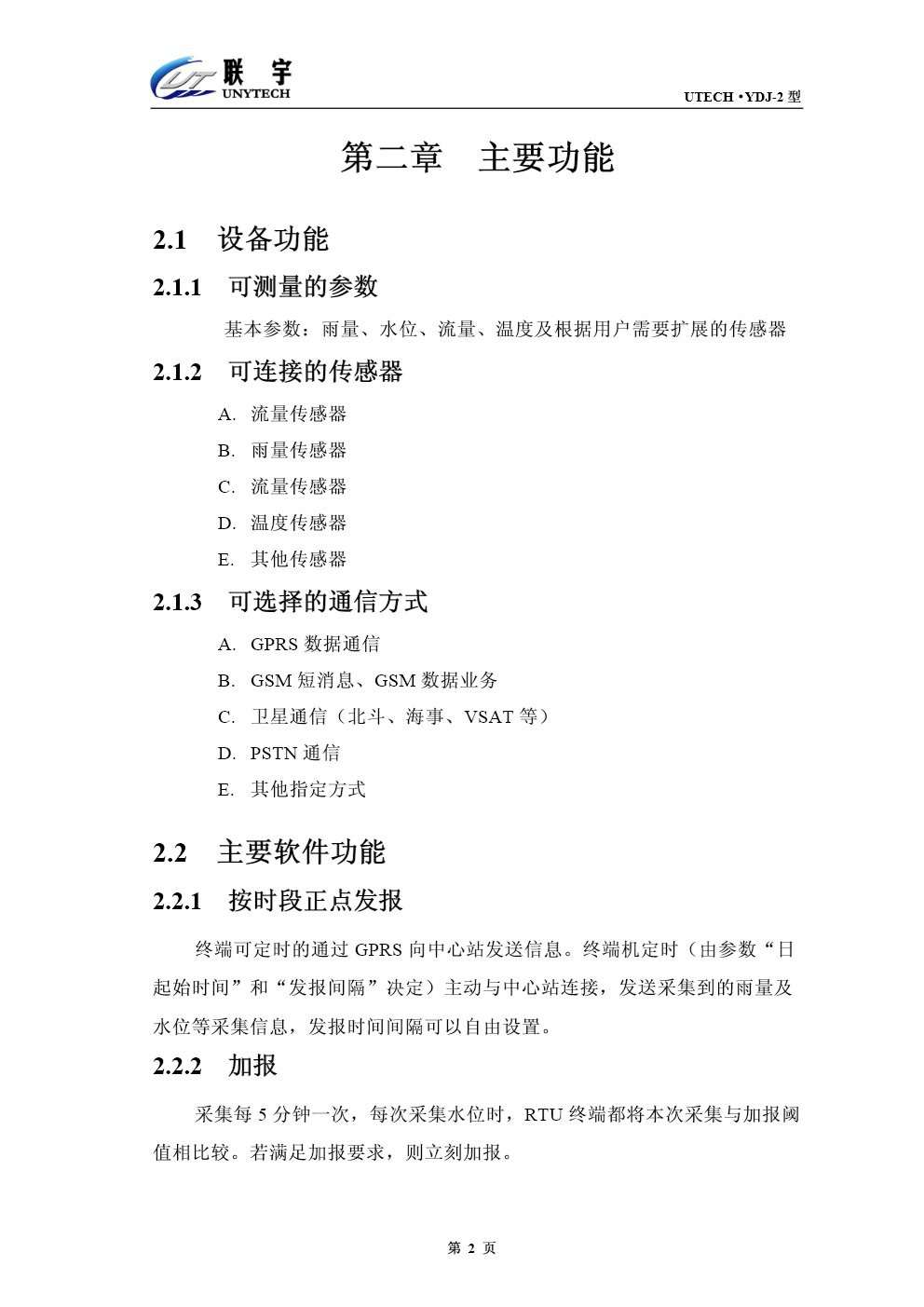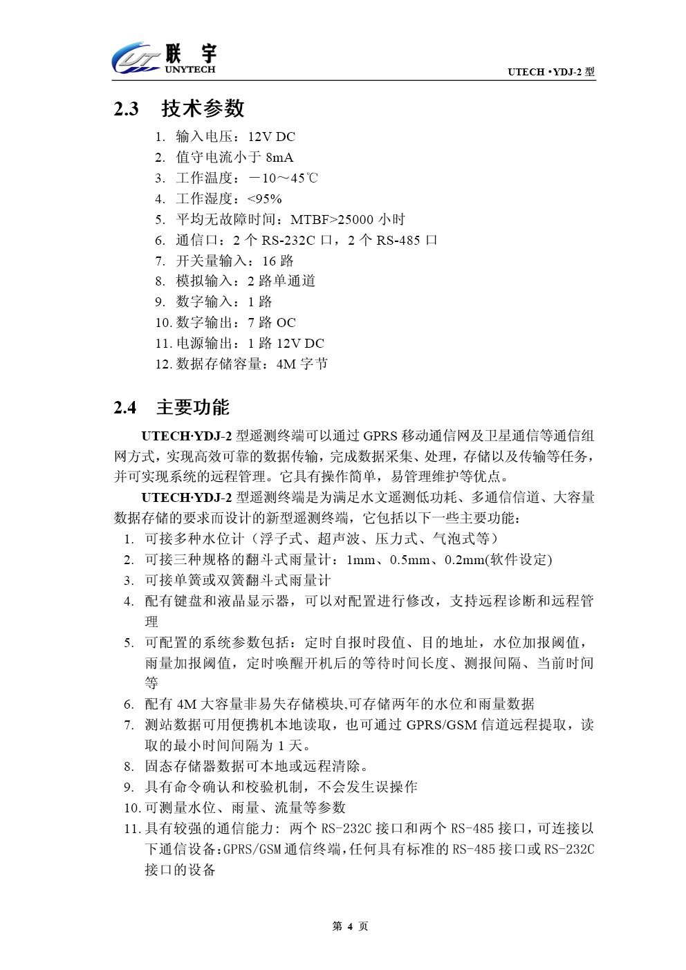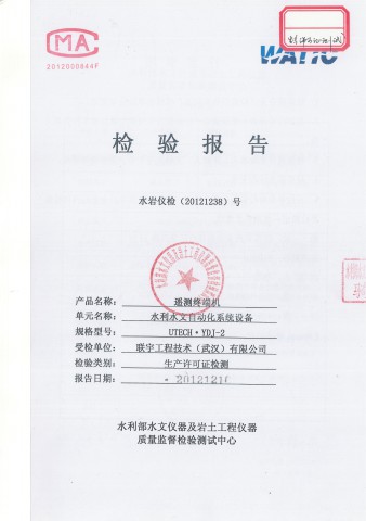 YDJ-2型遥测终端机是亚娱体育研发的一种高性能信息采集装置,集数据采集、显示、存储、通信和远程管理等 功能于一体。具有多种传感器接口,可监测水位、雨量、流量、风速风向、气温气压等多种参数,适用于山洪预警、水文遥测、气象 监测、水资源管理、中小河流治理、灌区信息化等项目。 规约检测 该装置已通过水利部水文仪器及岩土工程仪器质量监督检验测试中心型式检验 通过水利部水文仪器及岩土工程仪器质量监督检验测试中心《水文监测数据通信规约》规约检测 通过水利部水文仪器及岩土工程仪器质量监督检验测试中心《水资源监控管理系统数据传输规约》规约检测 获得湖北省质量技术监督局颁发的工业产品生产许可证水文仪器(鄂XK07-002-00005)。