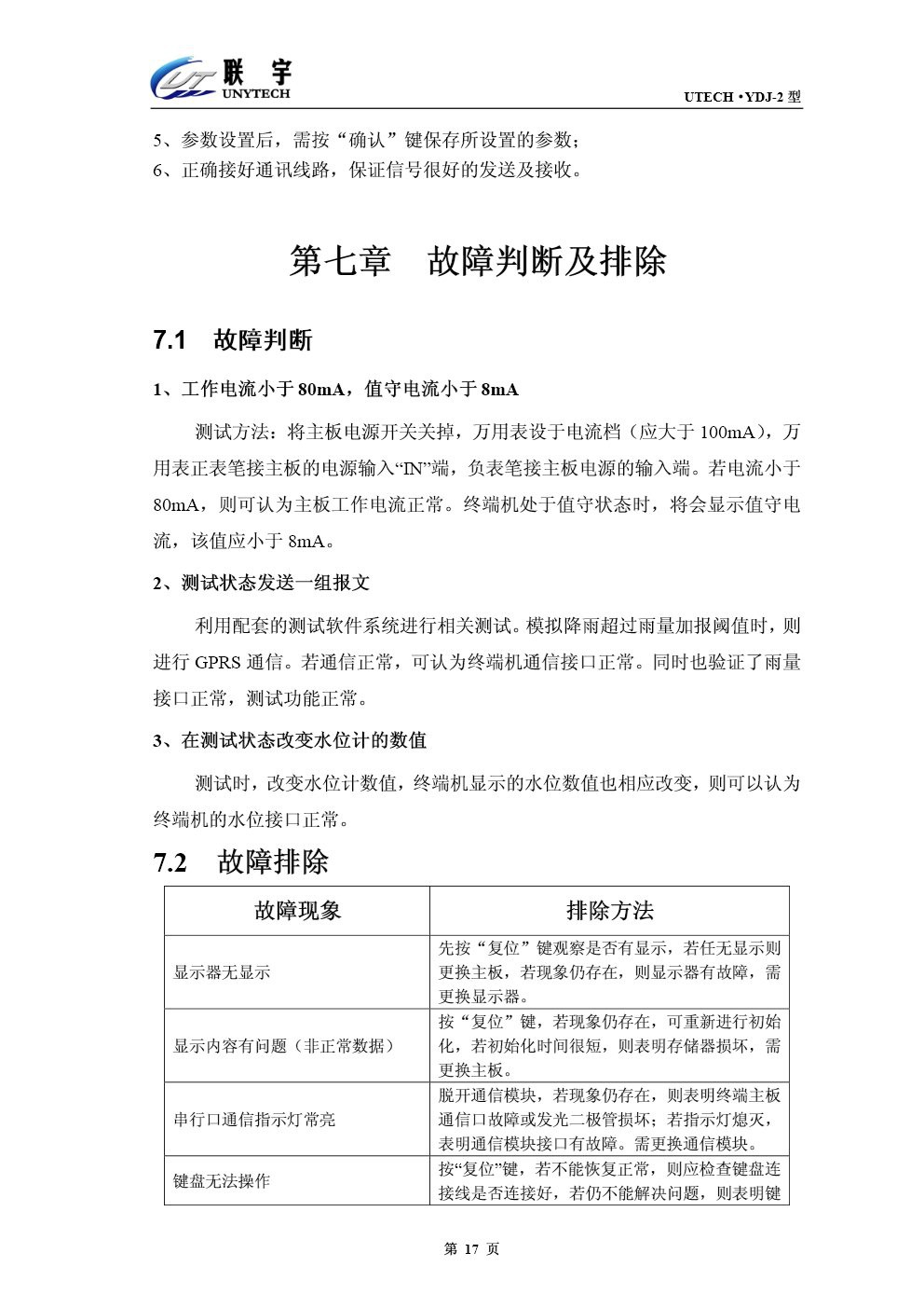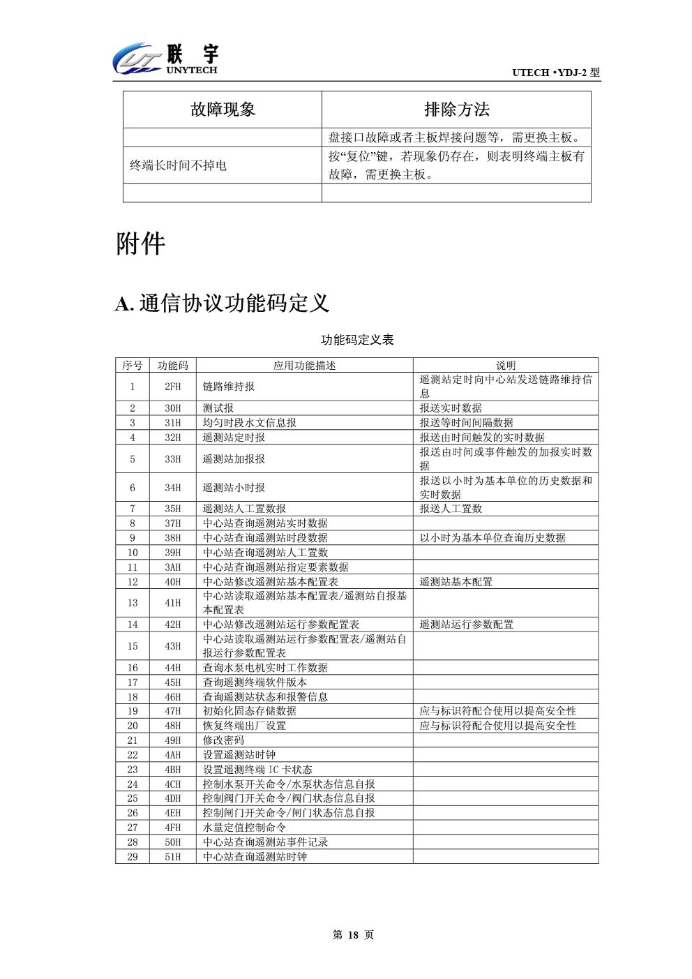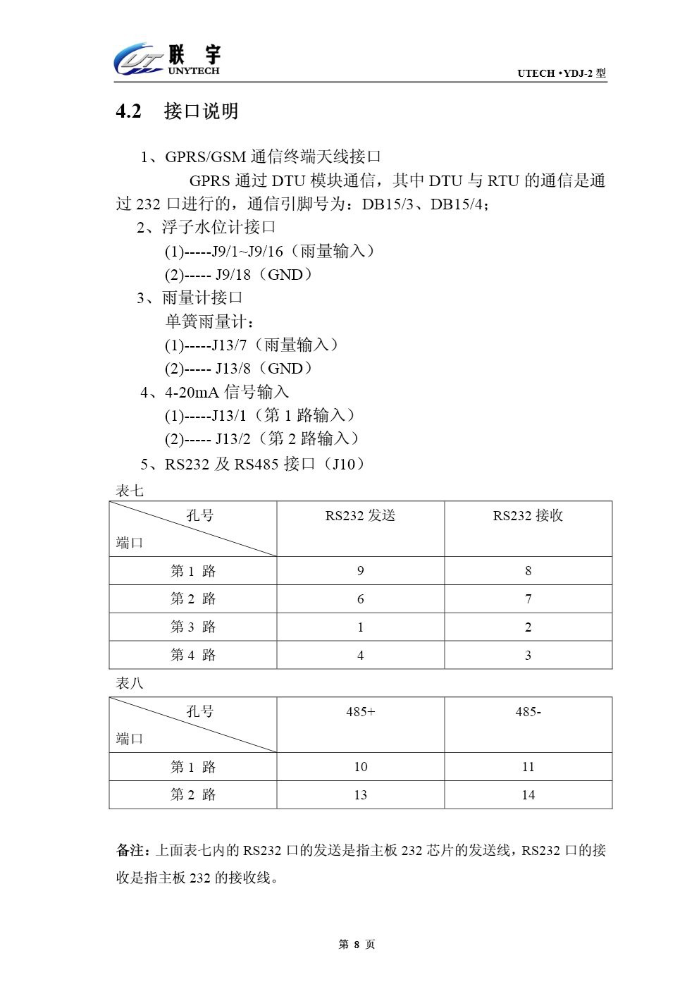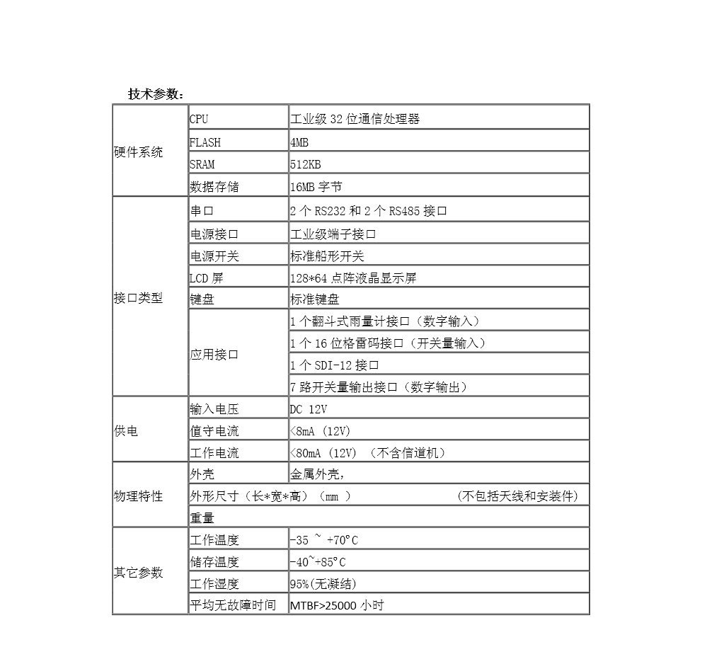 1、采集雨量脉冲数据 2、定时采集水位、流量、风速、风向、温度、湿度等数据 3、定时上报水位、流量、风速、风向、温度、湿度等数据 4、本地存储雨量、水位、流量、风速、风向、温度、湿度等数据 5、支持预警触发加报雨量、水位、流量等数据 6、支持远方较时功能支持本地或远程查询历史数据 7、支持远方控制输出功能 8、支持远程召测功能 9、支持远方控制输出功能 10、支持图片抓拍功能 11、支持本地人工置数功能 12、支持电池电压上报功能 13、支持设备运行工况上报功能 产品特点 工业一体化设计 产品由高性能的工业级32位中央处理器、存储单元、通讯接口、传感接口、键盘及液晶显示等组成,以嵌入式实时操 作系统为软件支撑平台,宽温设计,耐高低温,耐强电磁干扰,适用于各种恶劣的现场设备通过传感接口采集水文信 息,通过中央处理器进行数据处理,存入存储单元,通过通讯接口与中心站进行数据通信。 接口丰富 提供1个翻斗式雨量计接口、1个12位格雷码接口、2个RS232接口、2个RS485接口、1个SDI-12接口、7路开关量输 出接口,可接入雨量、水位、流量、温度、风速风向等多种传感器,并可根据用户需求扩展传感器,满足不同水文或 水资源及它领域需求。 支持多种通讯方式 GPRS/CDMA/3G/4G为主传输通道、短信为备份传输通道;可选北斗、卫星、PSTN、超短波、微波等通信方式。 配置大容量存储空间 配有4mb大容量存储模块,可存储两年的固态数据。 支持多种管理配置方案 配有键盘和液晶显示器,支持现场或远程参数查看及修改。 支持低功耗配置方案 低功耗设计,支持休眠和唤醒模式,响应远方召测。 保障数据安全设计 本地及远方固态数据提取;具备补发数据功能(主备信道通信均失败时,存储数据等待下次发送)。 支持设计拓展及研发 可根据客户要求规约研发、设计、生产定制。 |