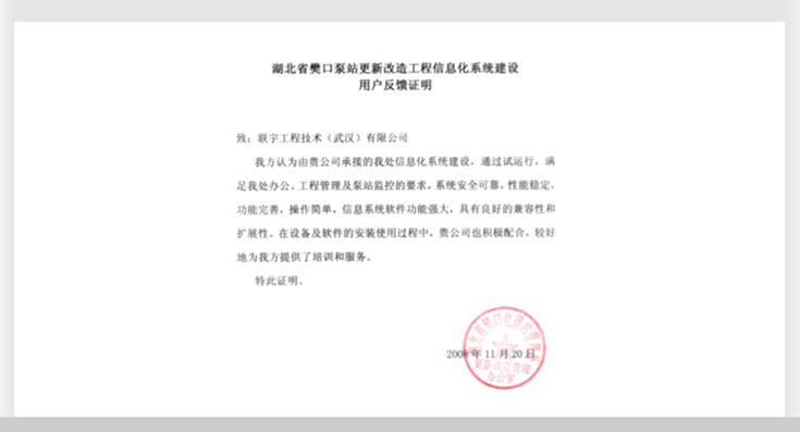 湖北樊口泵站更新建设改造工程信息化系统建设用户反馈证明